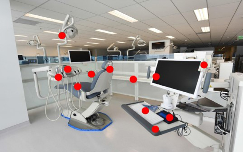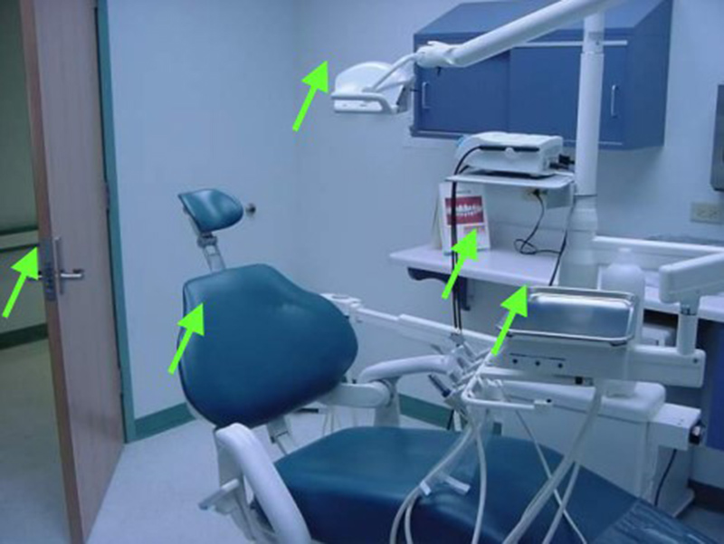 Sau mỗi ca điều trị nha khoa, những bề mặt tiếp xúc lâm sàng trên trang thiết bị như: ghế nha khoa, cần chỉnh đèn, cần chỉnh khay, bồn nhổ, khay đựng dụng cụ, tay xịt hơi nước, tay khoan, thiết bị vi tính,… cần được xịt khử trùng và lau sạch bề mặt bằng khăn lau khử khuẩn.