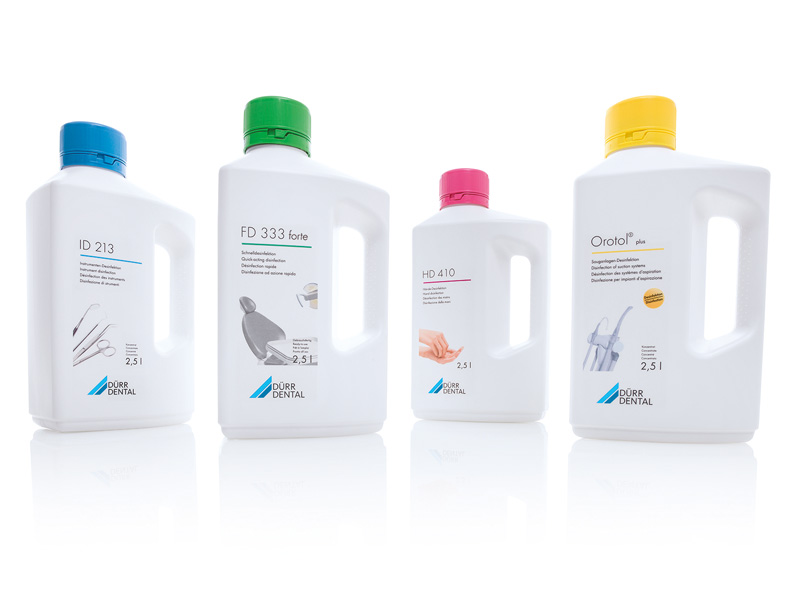 Sai lầm trong quy trình thực hiện khử khuẩn nha khoa có thể cực kỳ nguy hiểm. Vì lý do này, Durr Dental đã mã hóa màu sắc cho các chế phẩm bằng một hệ thống dung dịch diệt khuẩn qua bốn màu đặc biệt, ứng dụng cho từng lĩnh vực: màu xanh lá cây cho bề mặt, màu xanh dương cho dụng cụ, màu vàng cho các khu vực đặc biệt và bộ phận hút phẫu thuật, hút nước bọt và màu hồng cho da và bàn tay.