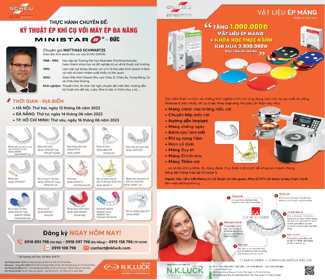 Để giúp mọi người có thể hình dung rõ hơn về cơ chế cũng như quy trình sản xuất một khí cụ nha khoa cơ bản như máng chỉnh nha, công ty vật tư nha khoa N.K.LUCK Việt Nam cùng đối tác Scheu Dental hân hạnh mời Quý Bác sĩ, Kỹ thuật viên tham dự Ngày Hội “Điêu Khắc” Scheu Dental. Đến với hội thảo này, chuyên gia Matthias Schwartze từ Scheu Dental (Đức) sẽ chia sẻ quá trình tạo hình và sử dụng các loại khí cụ quan trọng trong điều trị nha khoa hiện đại. Từ vật liệu ép máng tiêu chuẩn cao đến máy ép áp suất đa năng Biostar tiên tiến.