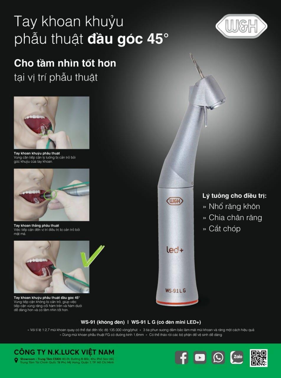 Tay khoan phẫu thuật sẽ có dạng thẳng (dành cho các phục hình răng cửa), dạng khuỷu (dành cho các phục hình răng cối, răng khôn). Tay khoan phẫu thuật của W&H đều trang bị đèn / không đèn để Bác Sĩ có thể chọn lựa cho phòng khám của mình.