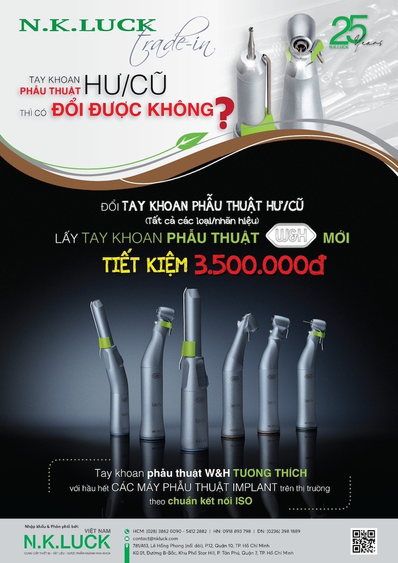 Thấu hiểu được sự tiếc nuối khi phải “cất tủ” những chiếc tay khoan có giá trị cao, N.K.LUCK đem đến chương trình TRADE-IN ĐẶC BIỆT ”thu cũ đổi mới”tất cả các loại tay khoan phẫu thuật cho tất cả các nhãn hiệu lấy tay khoan W&H sản xuất tại Áo. Bảo hành quốc tế 12 tháng.