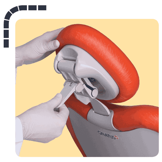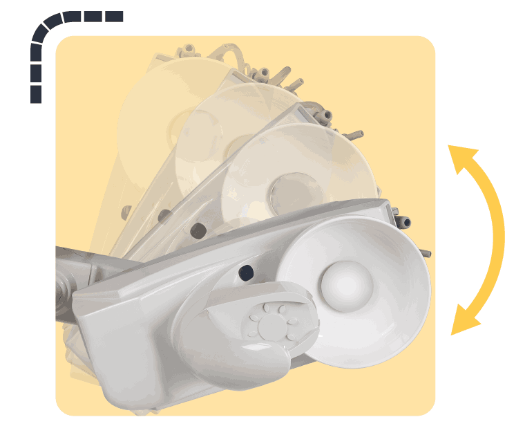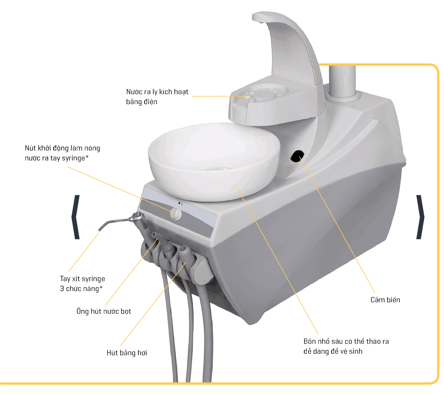 Bộ phận bồn nhổ có thể xoay chuyển cho phép dễ dàng kéo gần phía bệnh nhân trong quá trình điều trị.