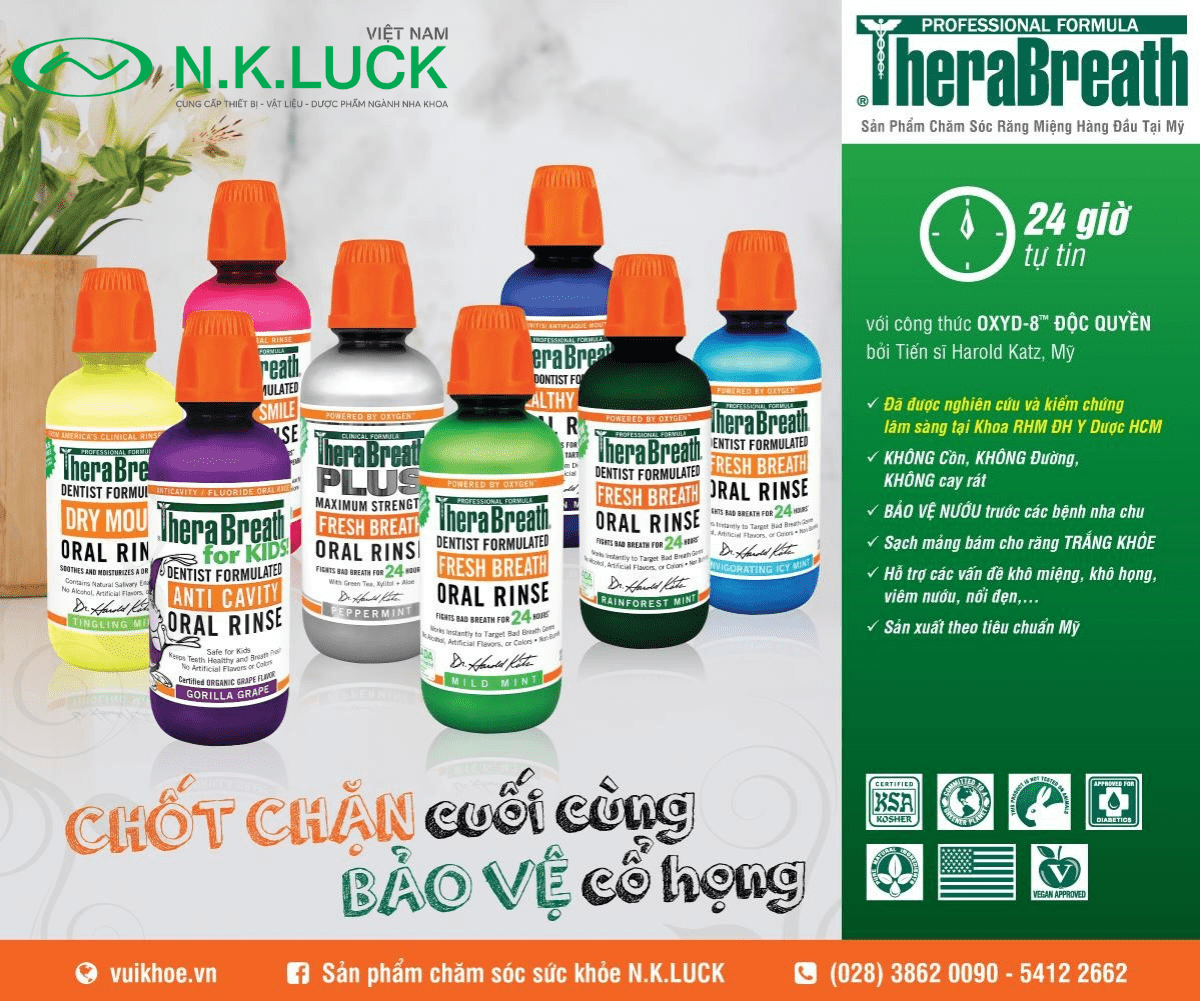 TheraBreath là dòng sản phẩm chăm sóc răng miệng cao cấp, được nhiều chuyên gia khuyên dùng trong điều trị hôi miệng hoặc các bệnh đường miệng số 1 hiện nay. Hãy cùng N.K.Luck tìm hiểu về TheraBreath trong bài viết dưới đây và khuyến khích khách hàng của mình sử dụng hàng ngày để đạt được hiệu quả điều trị tốt nhất!