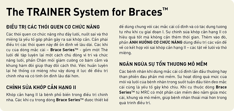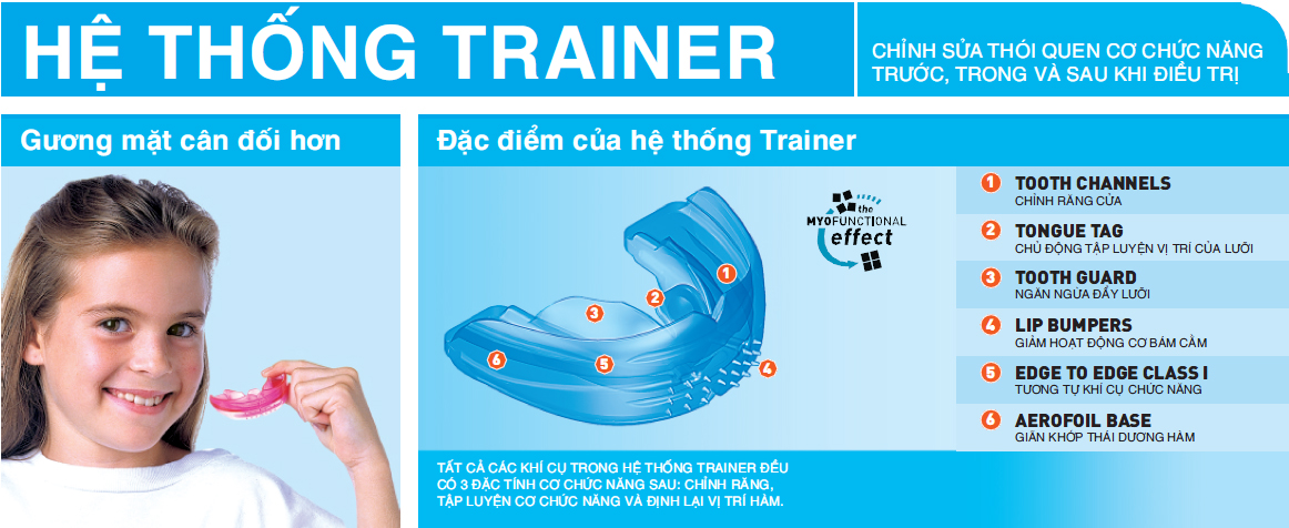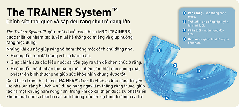 Infant Trainer ™ từ Myofunctional Research Co (MRC) là khí cụ một cỡ giúp tập cho trẻ có hàm răng sữa nhai đúng và luyện tập cơ hàm. Quan trọng hơn hết, Infant Trainer giúp trẻ luyện tập thở thông qua mũi, hướng dẫn trẻ cách nuốt đúng và đặt lưỡi vào đúng vị trí. Nghiên cứu đã chứng minh rất rõ ràng rằng sự phát triển đúng của khuôn mặt, hàm và răng phụ thuộc mạnh mẽ vào tất cả các yếu tố này.