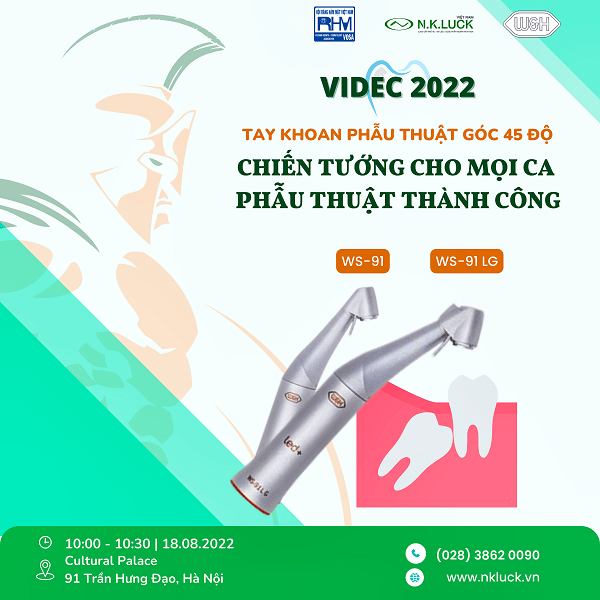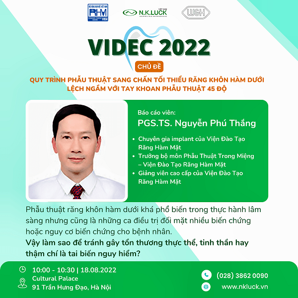 Hưởng ứng nhu cầu tiếp thu kiến thức về phẫu thuật ngày một gia tang trong ngành nha và hướng đến sự kiện nha khoa hàng đầu cả Nước VIDEC 2022, N.K.LUCK trân trọng gửi đến Quý Bác sĩ lời mời tham gia đề tài báo cáo của PSG.TS.BS. Nguyễn Phú Thắng – chuyên gia implant tại Viện Răng Hàm Mặt. PSG.TS.BS. Nguyễn Phú Thắng sẽ báo cáo chủ đề “Quy trình phẫu thuật sang chấn tối thiểu răng khôn hàm dưói lệch ngầm với tay khoan phẫu thuật 45 độ” với triết lý phẫu thuật răng khôn “An toàn, kiểm soát, đơn giản và sang chấn tối thiểu” giúp quá trình phẫu thuật răng khôn trở nên hiệu quả, nhanh chóng và bệnh nhân không còn ám ảnh với nhổ răng khôn vào 10:00 ngày 18/8/2022 tại hội nghị VIDEC.