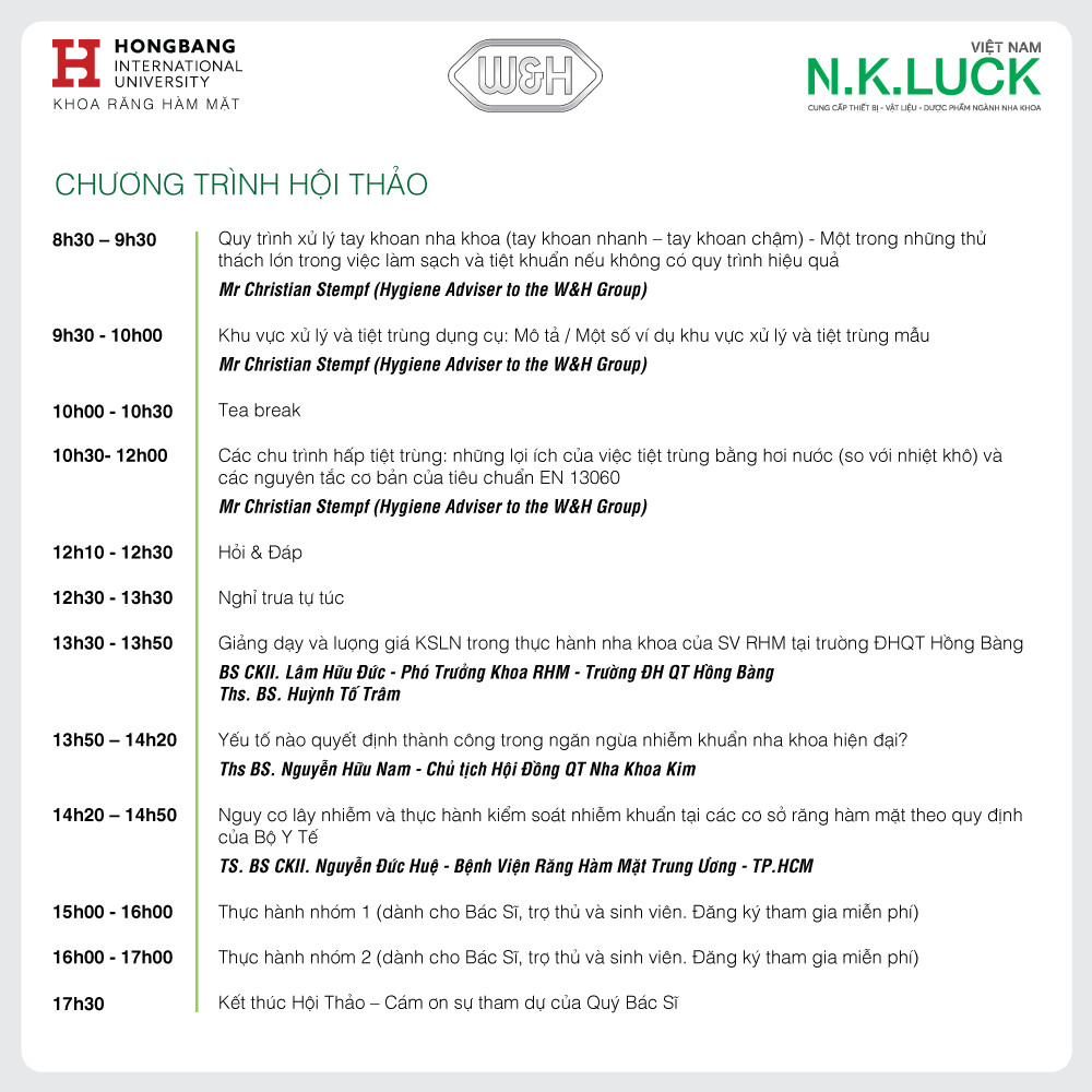 - 13h50 – 14h20: Yếu tố nào quyết định thành công trong ngăn ngừa nhiễm khuẩn nha khoa hiện đại