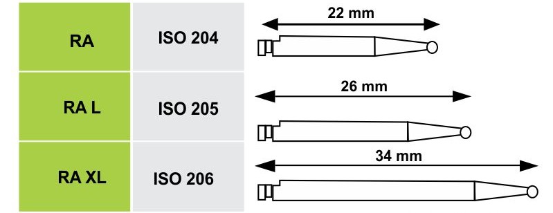 - Mũi mài cán khuyết: sử dụng cho tay gạt với tốc độ chậm (Counter-angle CA hoặc Latch-type Shank RA). Mũi có chỉ số ISO thông thường bắt đầu là 2xx. Thông số của mũi cán khuyết đường kính là 2,35mm, tổng chiều dài trung bình từ 22mm tới 34mm.